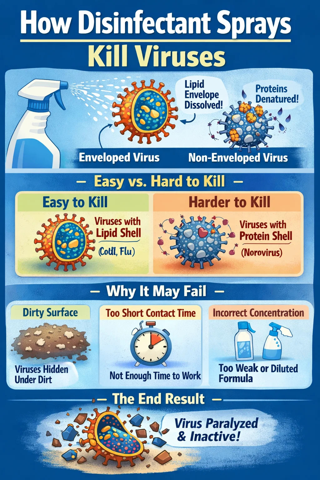 Disinfectant sprays can indeed kill viruses, but their mechanism of action is more like "physical dismantling" than the "poisoning" we might imagine.