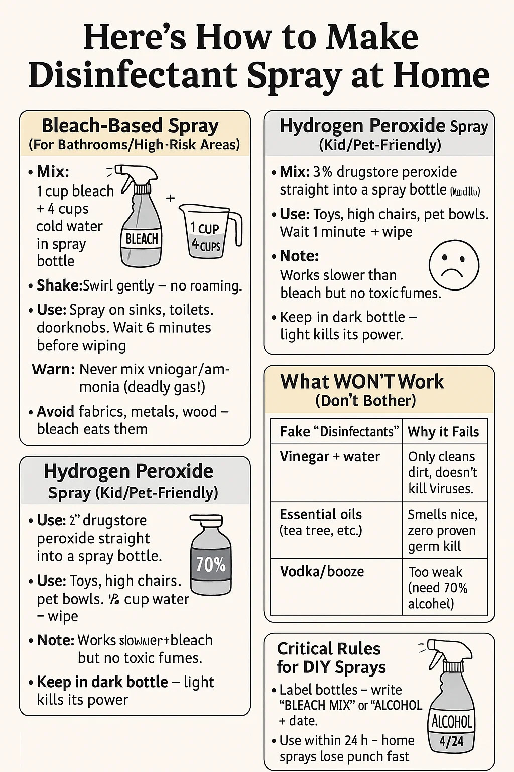 Label bottles – write “BLEACH MIX” or “ALCOHOL” + date.