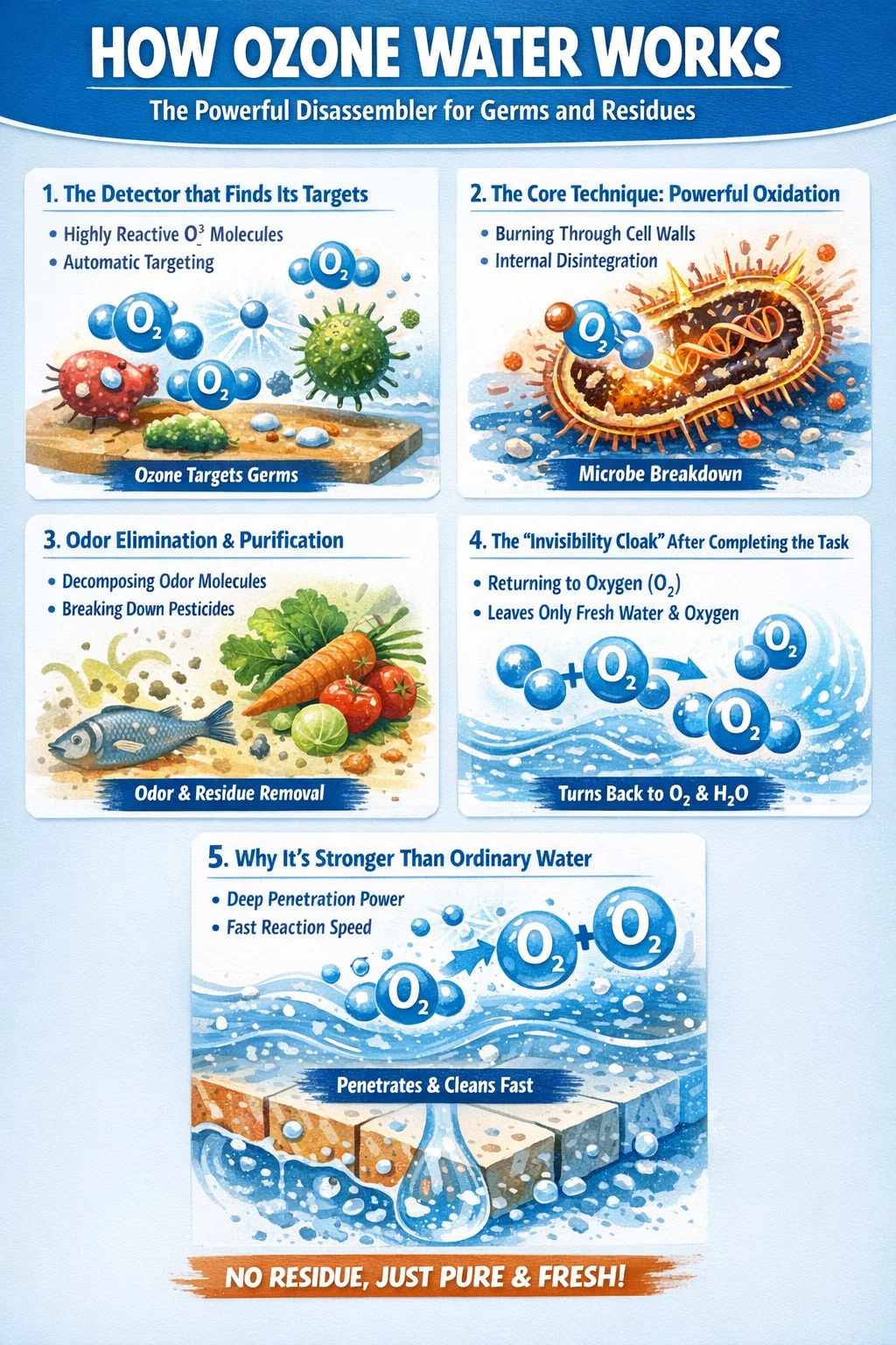 Ozone water works like a cleaning agent with a built-in "powerful disassembler." Unlike ordinary soapy water that simply washes away dirt, it completely breaks down germs at a microscopic level.