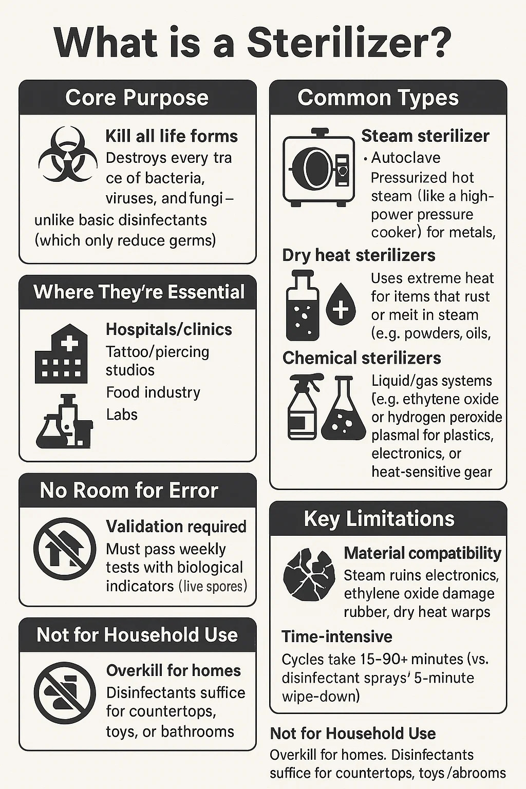 Steam sterilizers (autoclaves): Pressurized hot steam (like a high-power pressure cooker) for metals, glass, and heat-resistant tools.